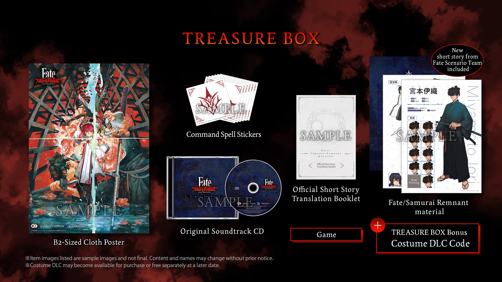Additionally, a special TREASURE BOX version of Fate/Samurai Remnant is currently available for pre-order. Sold exclusively through the NISA store, the TREASURE BOX includes the stunning Fate/Samurai Remnant material (art book), a B2 sized cloth poster, original soundtrack CD, Command Spell stickers, bonus costume DLC (set of two costumes), the Official Short Story Translation book, and a collectible box.