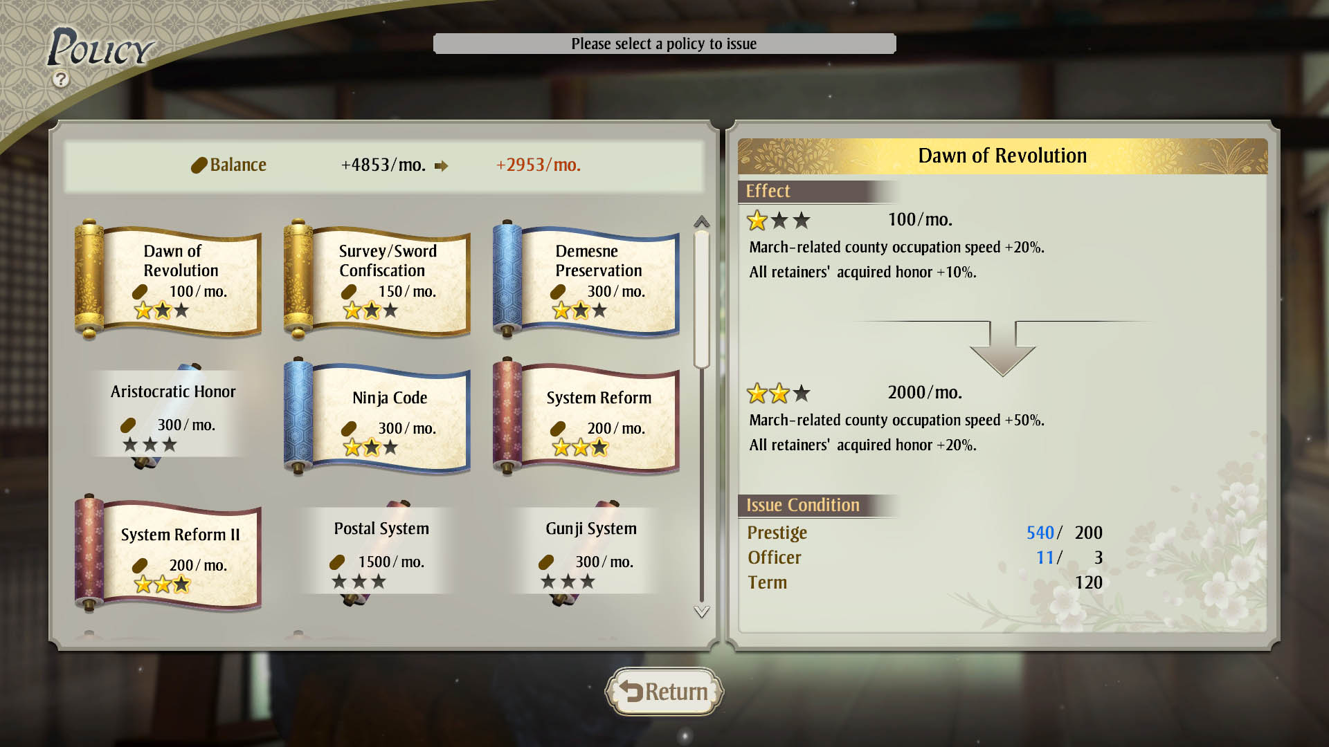 Players will issue policies which will impact the entire clan, and appoint land holders who will develop domains by themselves. In addition, they will also be able to appoint conservators, who can change the overall trend of the clan, as well as council officials to guide them when issuing policies. Players can even have direct talks with their officers to strengthen their allegiance and stop them from absconding, and these direct talks have the potential to open up new strategies as players deepen bonds with their retainers.