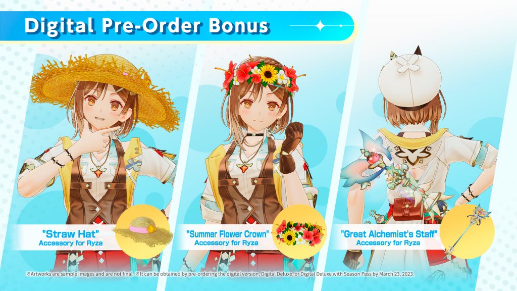 Players who pre-order the game by March 23, 2023 will receive the digital pre-order bonus “Straw Hat”, “Summer Flower Crown”, and the “Great Alchemist’s Staff”. These exclusive accessories can be equipped by Ryza separately from her costume.
