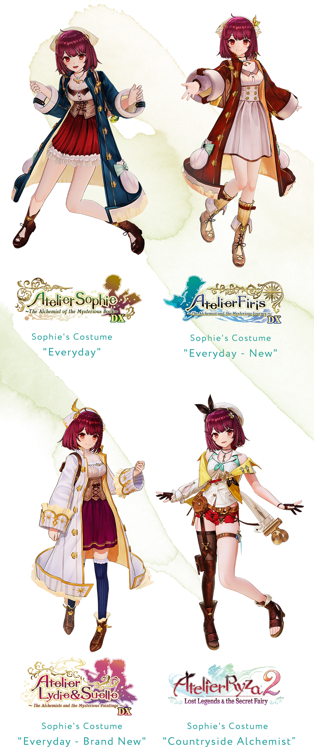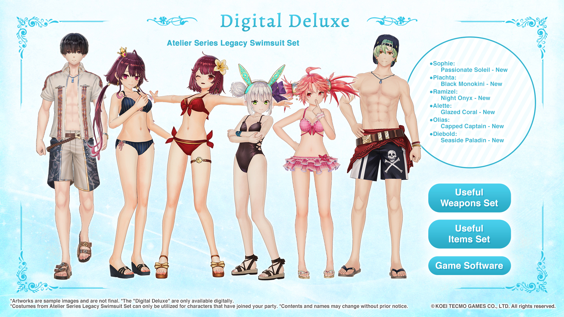 The Swimsuit Set for Sophie, Plachta, Ramizel, Alette, Olias, and Diebold has been inspired by swimsuits of the previous "Atelier" franchise for a total of 6 variations.