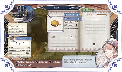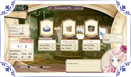 Synthesizing allows the alchemist to combine various materials into something new. Depending on how it's made, even the same item can have different effects and values.